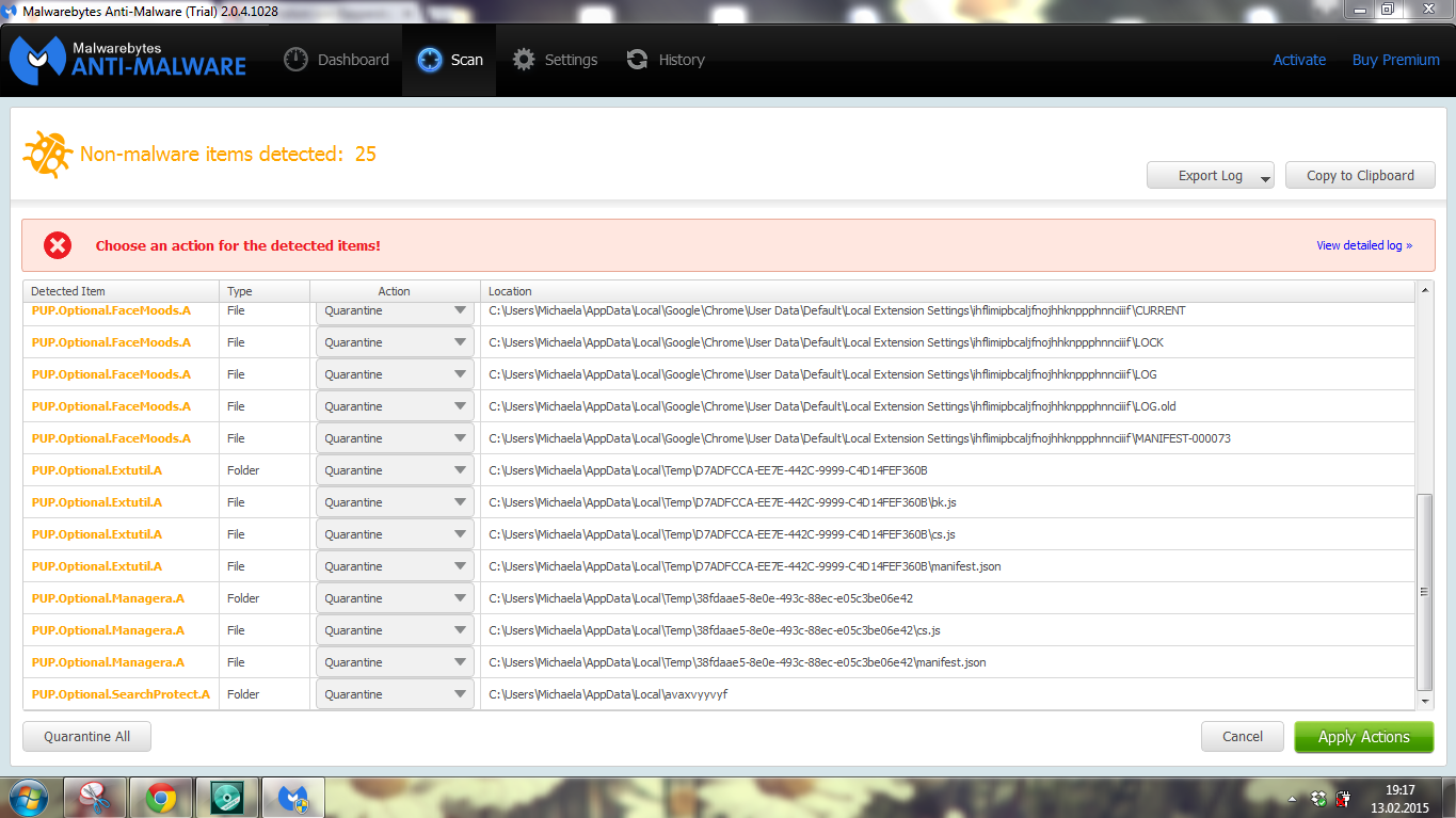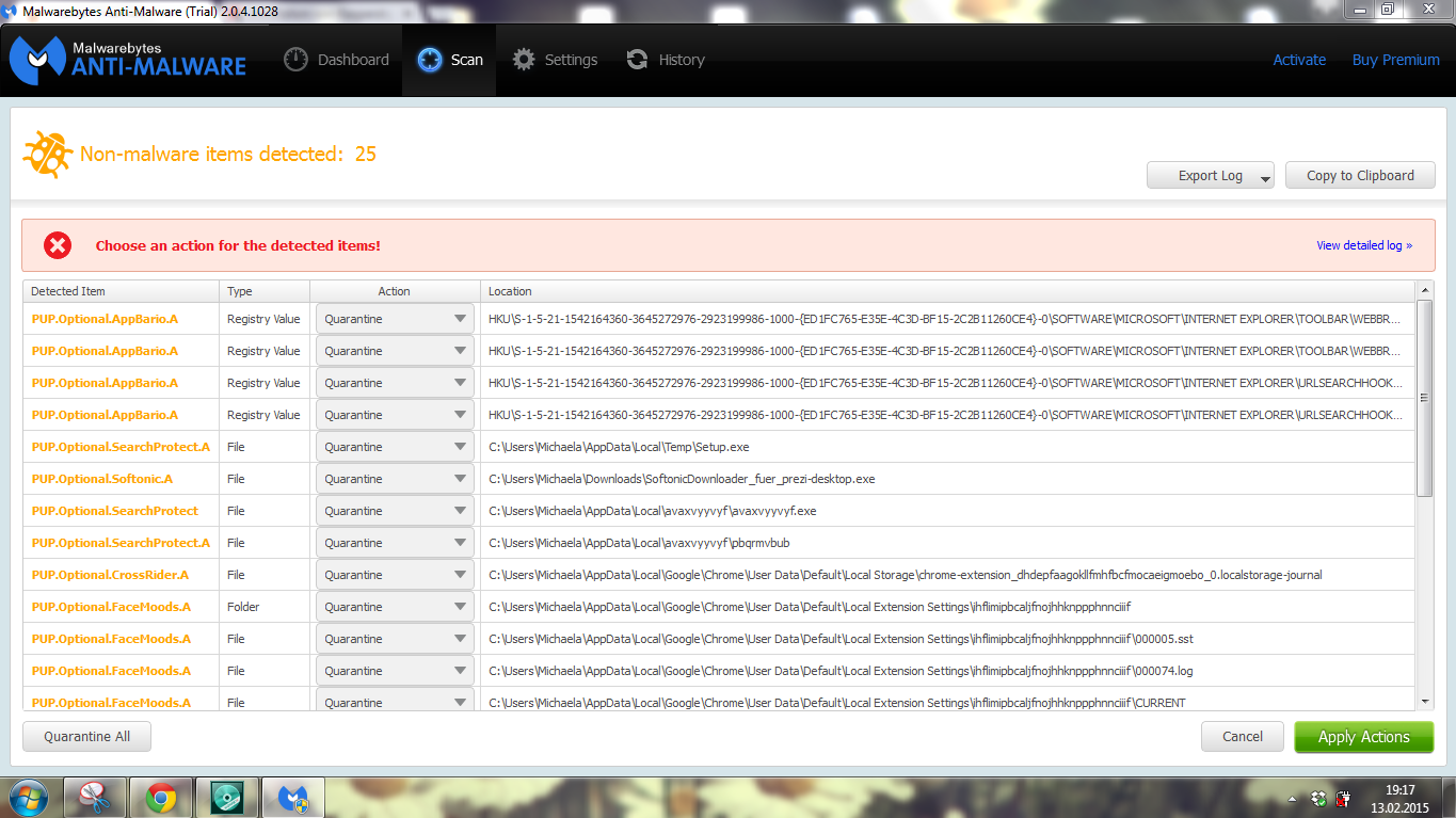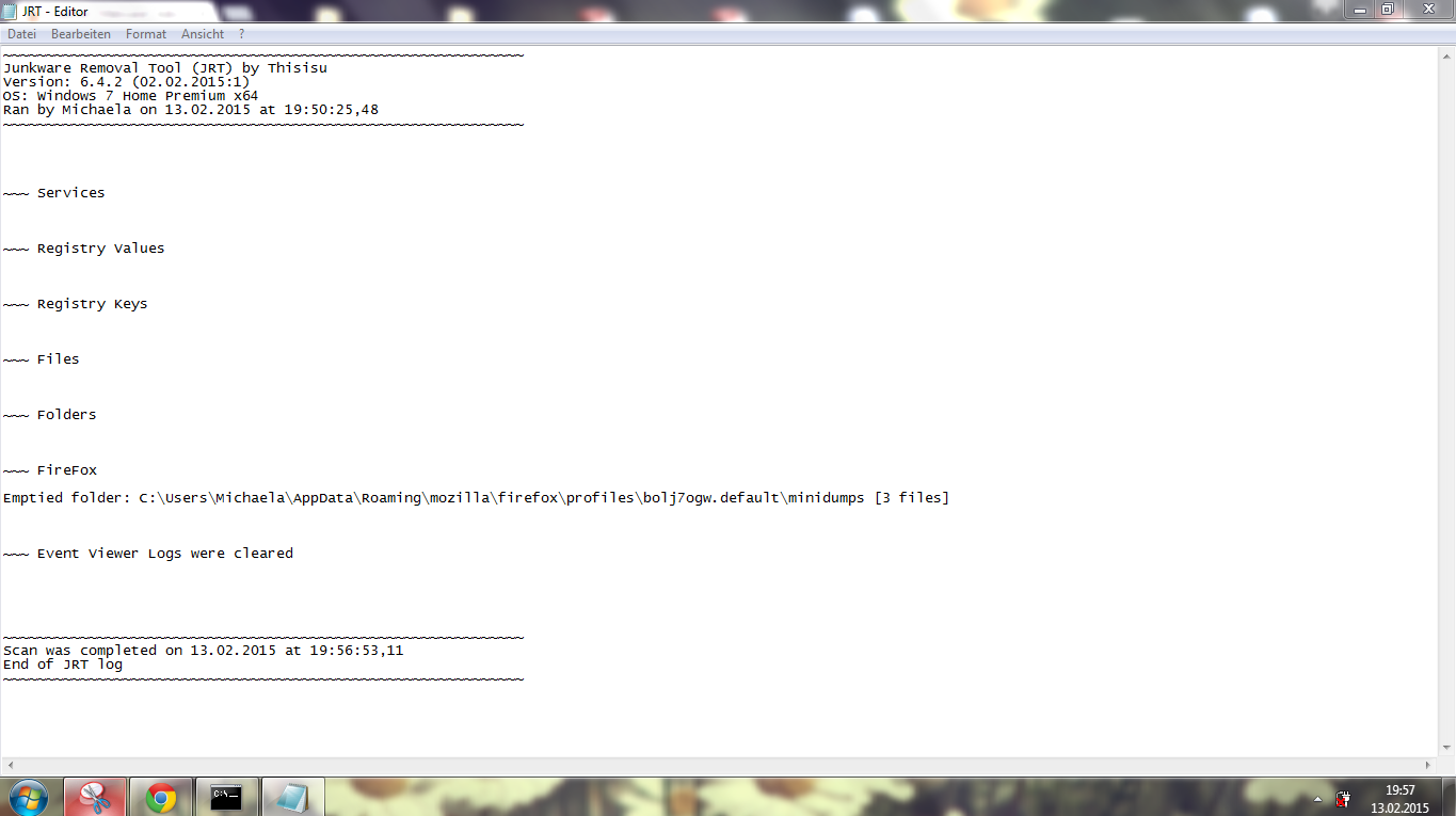 Wichtig ist das du die ganzen Funde von AdwCleaner löschen lässt und danach sofort das System rebooten lässt durch AdwCleaner. Danach versuche Malwarebytes runterzuladen, installiere das, lehne die Testphase für Malwarebytes Pro ab und mache mit Malwarebytes kostenlos einen Benutzerdefinierten Suchlauf deines kompletten Systems und lass die Funde von Malwarebytes ebenfalls löschen und poste das Logfile. Danach lade JRT runter, führe das als Administrator aus, mache während der Überprüfung nichts, reboote danach auch das System und poste auch das Logfile. Dann gib mal Rückmeldung wie sich dein System dann verhält.