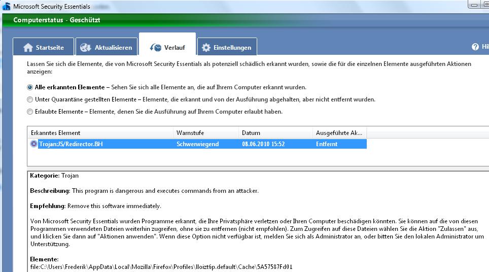 die fundmeldung von mse bezieht sich, wie erwähnt, auf den browsercache.