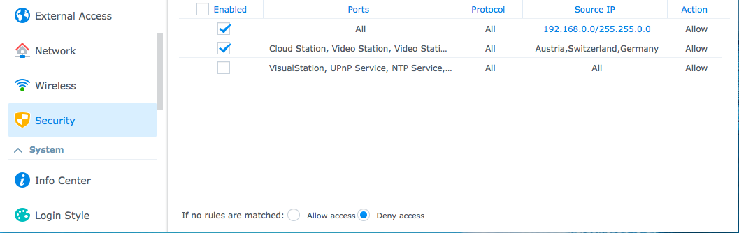 nonimos schrieb:haut doch auf dem NAS einfach die firewall mit country-lock rein. wenn ihr nicht vom ausland zugreift reicht es völlig, wenn nur IPs aus AT oder DE zugreifen dürfen. Ausserdem ist zu empfehlen "auto-block" unter security einzuschalten (autom. IP-sperre nach z.b. 5 falschen passwörtern, kommt nur aus DE allein ca wöchentlich vor, ohne country-lock alle 5 min angriffe (bin nirgends gelistet)). wenn's dann noch gekapert wird ist offenbar ein virus/keylogger am pc, von dem aus zugegriffen wird...Anhang anzeigen 431902
