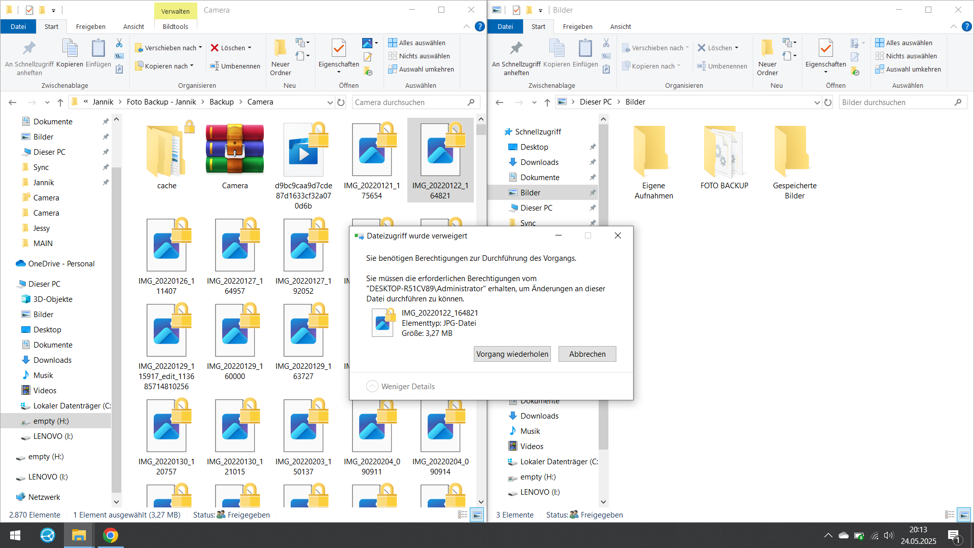 Das Problem ist, dass mir Windows beim verschieben der Fotos sagt, dass ich keinen Vollzugriff habe. Nach genauer Prüfung aller Möglichkeiten habe ich jedoch Administrator Vollzugriff auf alle Speichermedien (externe HDD als auch interne SSD vom Laptop).