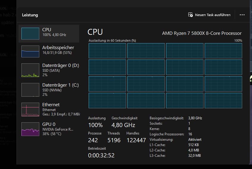 Dabei läuft meine CPU konstant auf 100 % Auslastung (alle Kerne, gerade Linien in der Auslastungsanzeige).