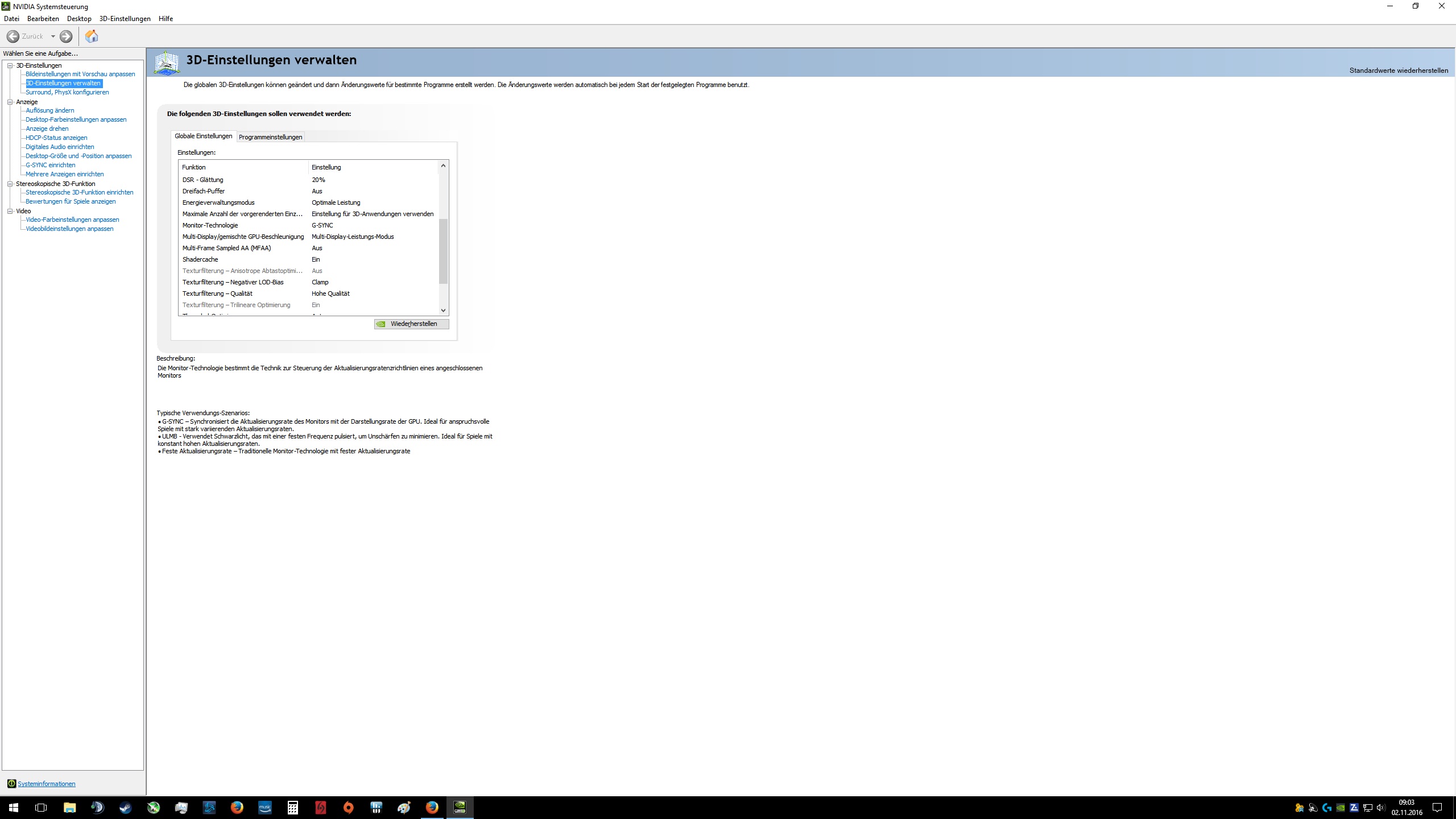 Wie gesagt, Gsync funktioniert immer, aber um auch das Tearing zu verhindern gibt es eine Vorraussetzung. Die Hz Zahl MUSS immer höher angegeben sein als die aktuelle FPS im Spiel. Sei es direkt im Spiel, oder im Treiber, die Hz Zahl lassen sich meist auch im Spiel einstellen, falls das Spiel die Einstellung hat. Direkt in den Einstellungen von GTA 5 kann man wählen zwischen 60,85,120,144hz. (Im Treiber natürlich 120 oder 144hz einstellen) Wenn ich 60hz in GTA 5 einstelle, und die FPS zB mit Nvidia Inspector für GTA 5 auf 70FPS oder höher limitiere, habe ich zwar kein stottern mehr, aber extremes Tearing. Weil die FPS manchmal über 60 kommen, bei 2 FPS mehr als die Hz hab ich Tearing. Gehen die FPS unter 60, verschwindet das Tearing. Um auch das Tearing zu verhindern, muss ich also die FPS auf 60 limitieren. Dann ist das Tearing und natürlich dank Gsync auch das "Stuttering" komplett weg. Das Bild ist vollständig flüssig. Wenn ich aus Spaß Gsync im Treiber ausmache, ist es nie richtig sauber, das Bild zuckt und stottert etwas.