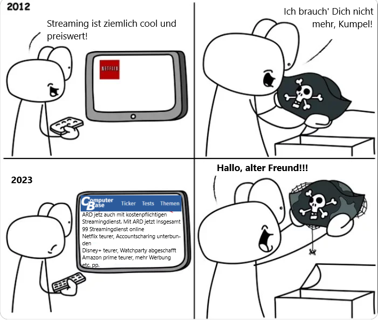 Das macht doch heutzutage keiner mehr in Zeiten von Smart TVs, Smarters Pro App und IPTV Abo. 20000 öffentliche und private Sender, 300000 Filme und Serien aus aller Welt. Inklusive dem Inhalt der großen Streaming Dienste. Für weit unter 100€ pro Jahr.SANDTIGER schrieb:Puh , da wird das Downloaden immer attraktiver -und dann wundern .