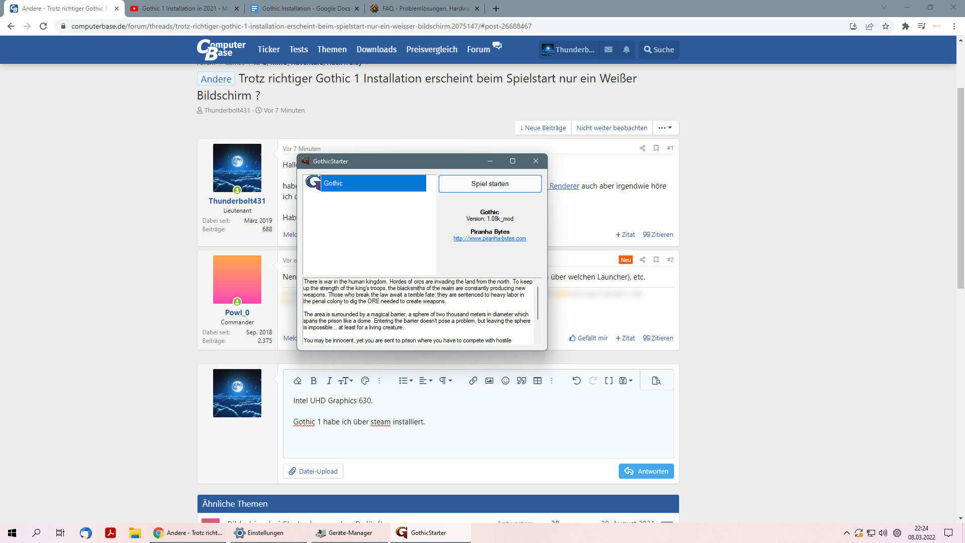 habe gerade versucht Gothic 1 zu installieren. Communaty Patch ist drauf. DX11 Renderer auch aber irgendwie höre ich das Spiel nach dem Start aber der komplette Bildschirm ist weiß..