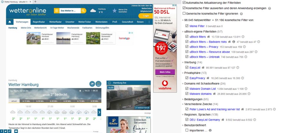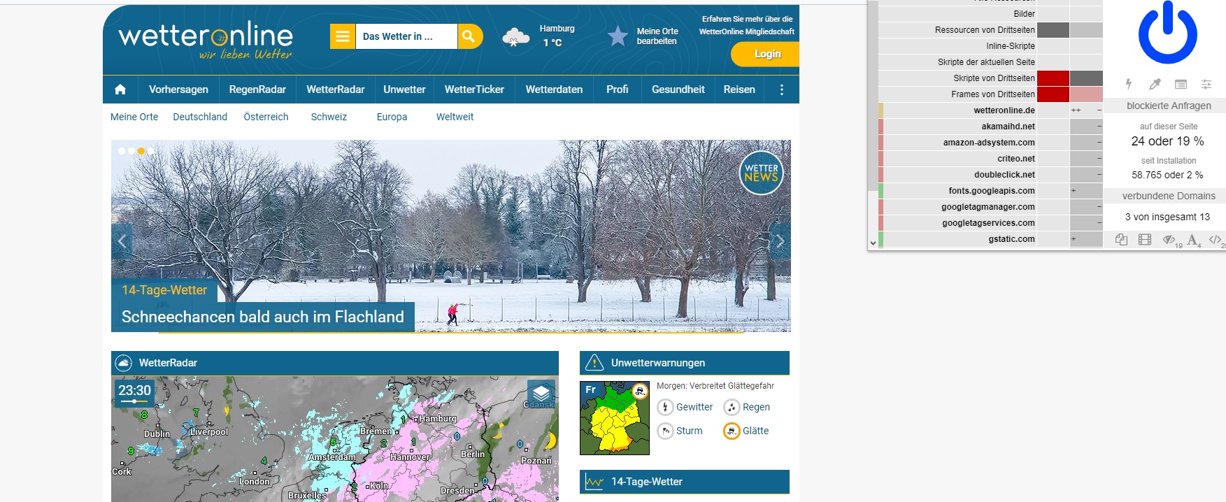 Ich benutze Firefox. uBlock ist aktiv und zeigt in seinem roten Symbol 111 blockierte Anfragen. Bei mir ist WetterOnline auch die agressivste Webseite, die immer mal wieder mit neuen Tricks versucht uBlock auszutricksen. Bisher reagierte uBlock immer schnell. Aber diesmal kommt die Werbung länger durch.