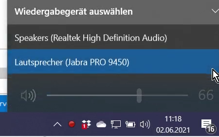 Es sollte ein Fenster mit der Lautstärkeregler-Leiste erscheinen und darüber das aktuelle Audiogerät.