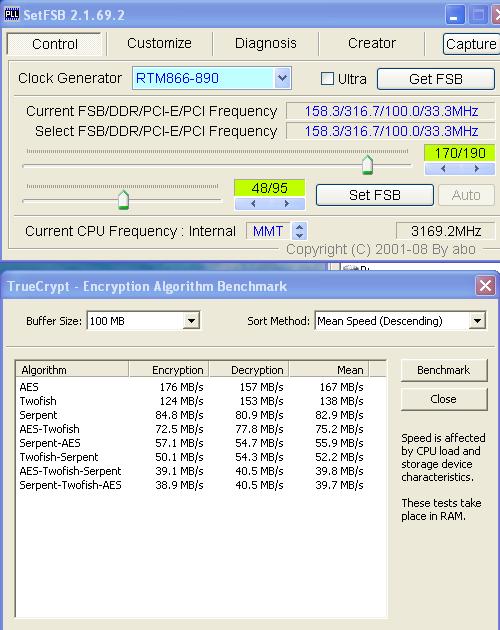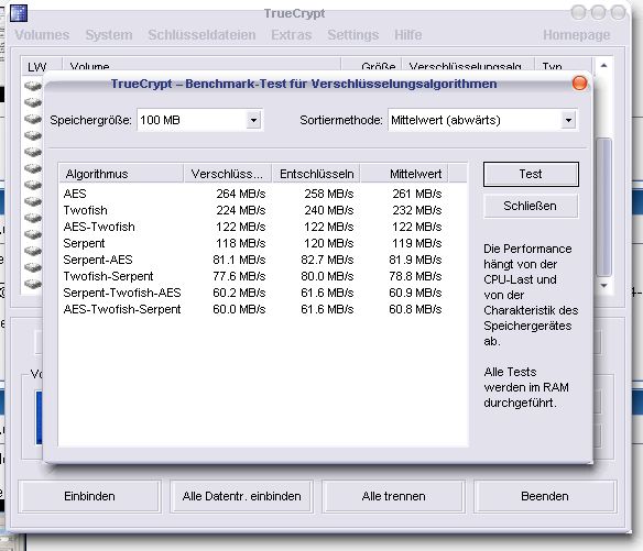 Habe nochmal nachgebencht, nachdem die Werte für den anderen Q6600 aufgetaucht sind kamen mir meine Werte doch sehr madig vor. Vielleicht kann man das ja in der Tabelle korrigieren, ich will ja keinen falschen Eindruck der Software vermitteln. Grund war eine im Hintergrund laufende programmierte Aufnahme der TV-Software.fuh schrieb:Bin etwas überrascht von der neuen Version, dass sie so pltzölich kam. Nun gibts ja mit dem Hidden OS die Funktion, die damals DriveCrypt++ so einmalig machte. Bin mal gespannt wie weit TC nun weiter boomt.