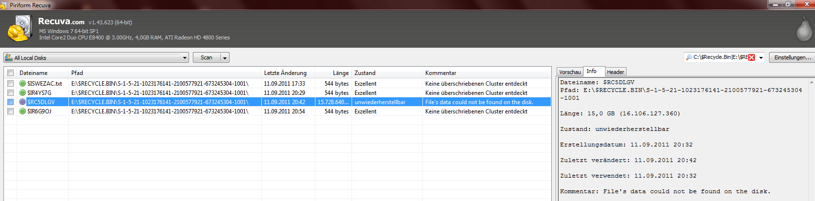Muss ich in meinem Fall bei Datenrettungsprogrammen auf C:/ (interne 500GB-Festplatte mit Betriebssystem, wo sich der Papierkorb befindet) oder auf E:/ (externe Festplatte) suchen? Hab ich die Datei nun von E:/ oder vom Papierkorb (C:/) gelöscht? Ist für mich ein bisschen verwirrend.