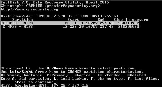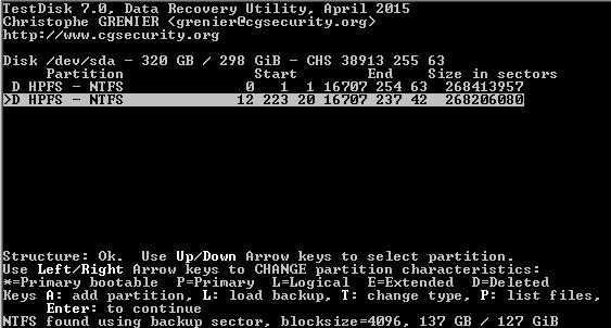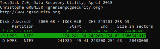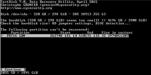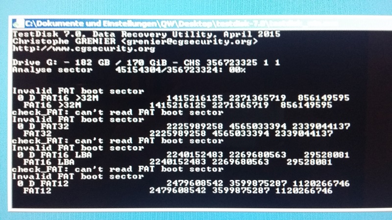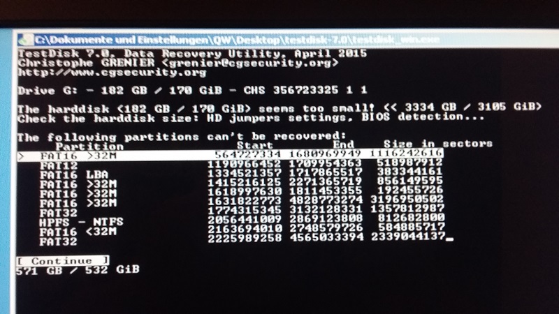 Ich habe nach dem Lesen hier probiert mit TestDisk irgendetwas herauszufinden. Da bekam ich diesen Festplattensektor angezeigt und bei der tieferen Suche dann folgende Meldung: "The following partition can't be recovered."
