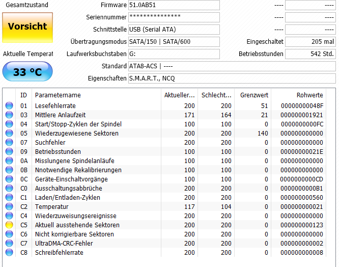 Kann mir jemand was zu dem angehängten CrystalDiskInfo Werten sagen. "Vorsicht" kann ich selber deuten. Was wäre der nächste Schritt (außer der Kopie) um die Platte wieder mit Truecrypt mounten zu können?