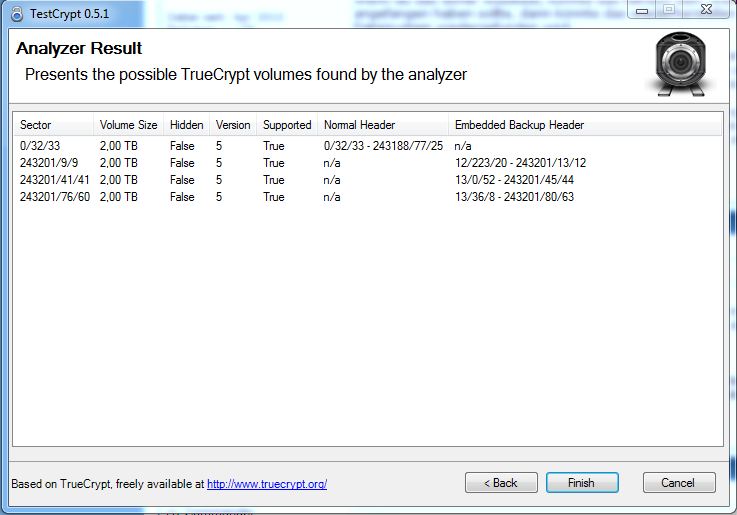 Ich bin mir auch gerade nicht 100% sicher, inwieweit Truecrypt die Partition noch mounten würde, wenn das der Fall wäre. Es kann gut sein, dass Truecrypt nur die Konsistenz des mit dem eingegebenen Passwort entschlüsselten Headers überprüft und den Schlüssel dann stumpf in den Algorithmen anwendet, ohne sich um das Ergebnis zu kümmern.
