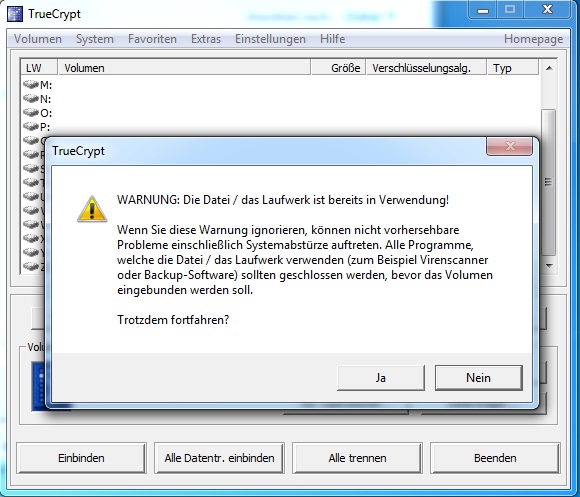 Ich habe heute eine SSD in meinen Rechner eingesetzt und danach mein System komplett formatiert. In diesem System habe ich eine 1 TB Platte die komplett mit Truecrypt verschlüsselt ist. Diese habe ich natürlich NICHT formatiert. Allerdings habe ich diese auch nicht während der Installation angekabelt...Nach der Windows 7 Installation, habe ich TrueCrypt installiert und wollte das Laufwerk wieder einbinden. Seit dem erscheint folgende Fehlermeldungen (siehe Anhang). Klicke ich dann trotzdem auf JA, kommt die nächste Fehlermeldung und nichts wird eingebunden...
