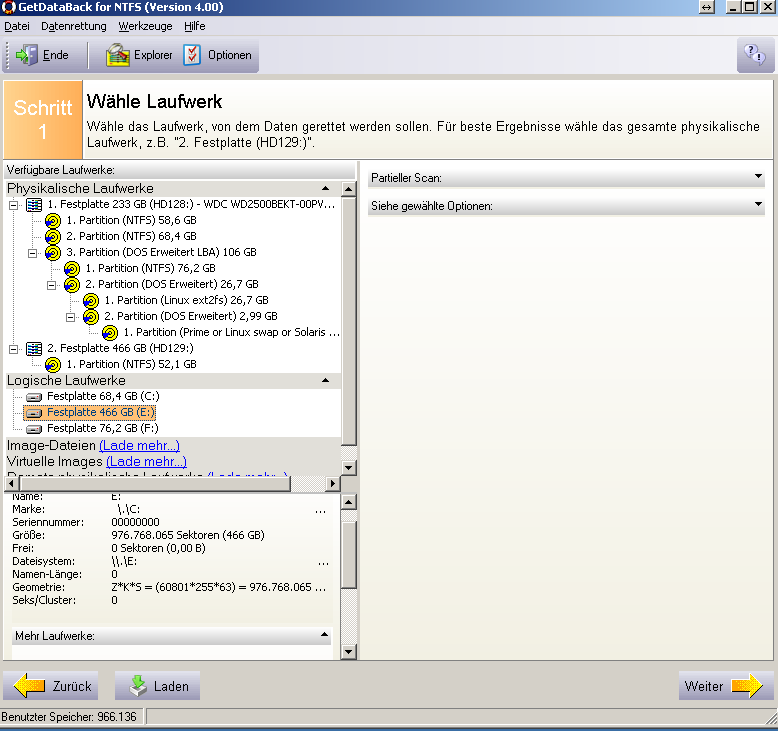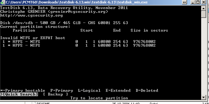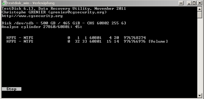 Entweder versucht ihr mit testdisk, die zwei falschen zu löschen und die richtigen Werte für die Partition mit 0/1/1-60800/254/63 einzugeben, oder wartet bis zum Abend, wenn ich Zeit dafür habe.