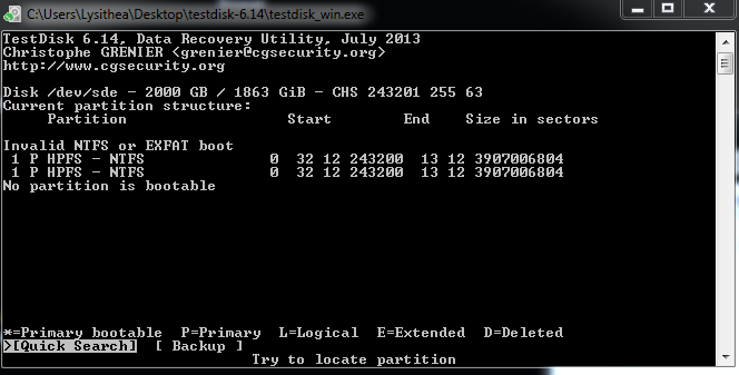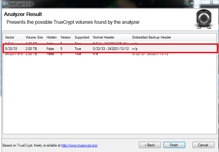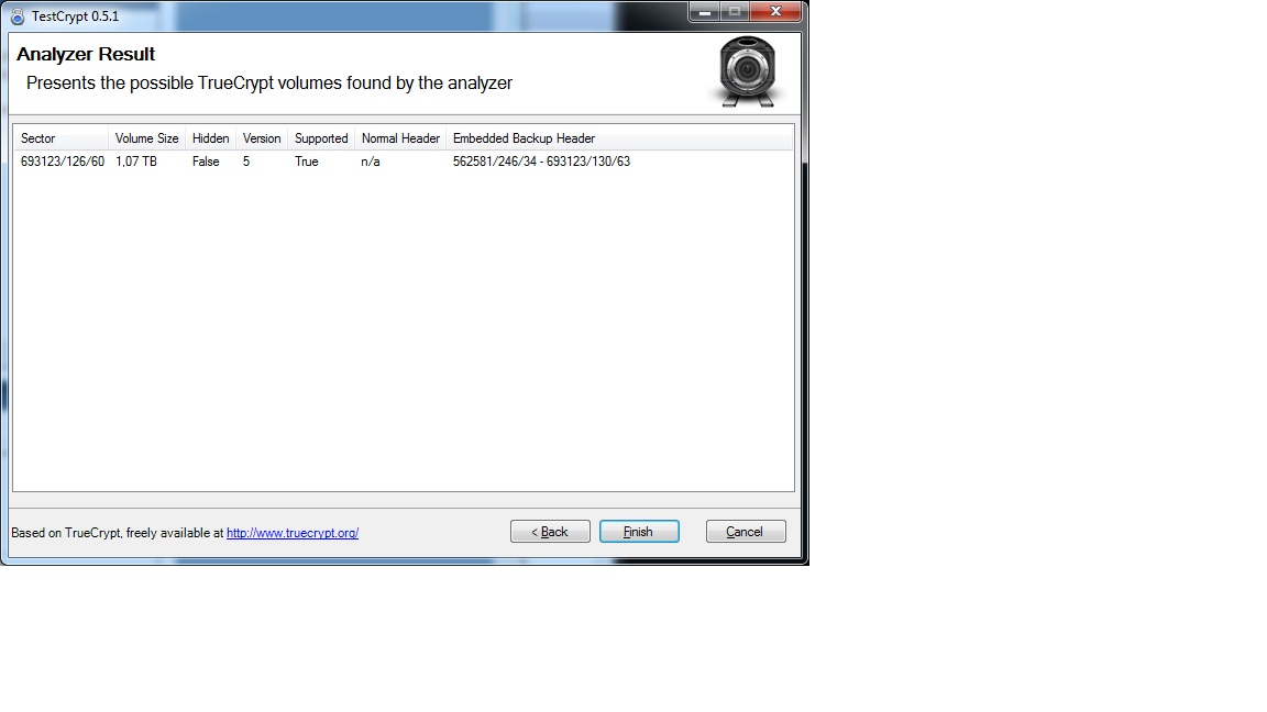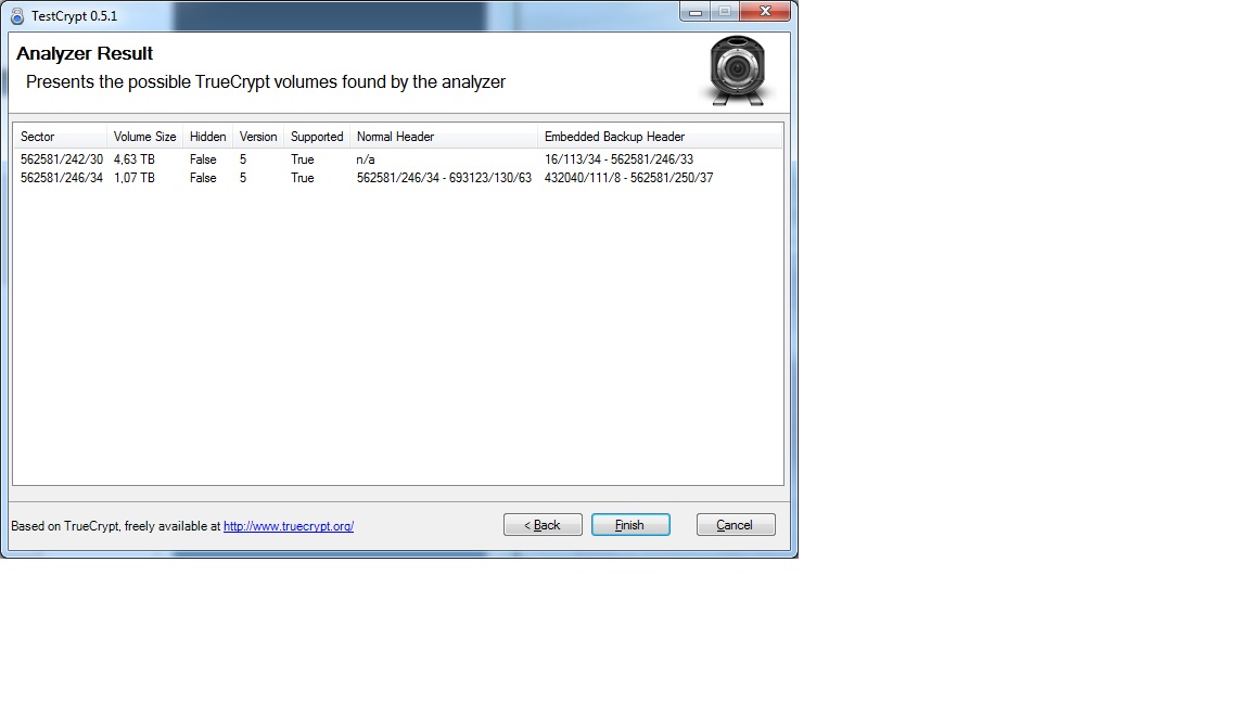 Hier ist das TestCrypt ergebnis, der Header, der Funktioniert ist der Markierte. Damit kann ich auf die Platte zugreifen.