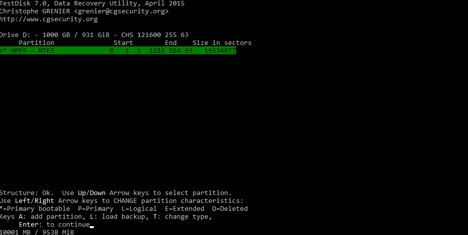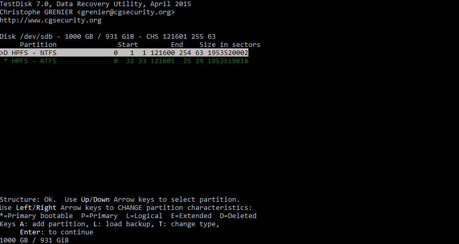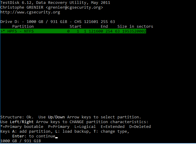 Das Ende der Partition passt nicht. Es kann sein, dass testdisk die Eingabe des letzten Zylinder (121600) mal wieder nicht zulässt. Versuch mal testdisk-6.12 (in neueren Versionen fehlt die Option) und wähl nach [Intel] [Options] und stell dort "Allow partial last cylinder" auf "Yes".