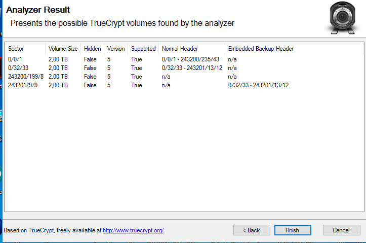 Erstaunlich ist, wie 4 Header auf die Festplatte kommen und noch dazu teilweise an Stellen, die eigentlich unmöglich sind. Hast du mehrfach versucht, in TrueCrypt die Header wiederherzustellen? Wurde dazu auch ein externes Header-Backup verwendet?