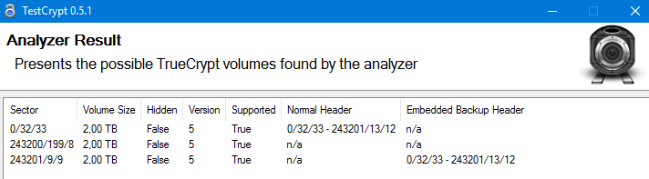 Hab die gesamte Festplatte schon mit TestCrypt 0.5.1 gescannt ohne das ein Header gefunden werden konnte.