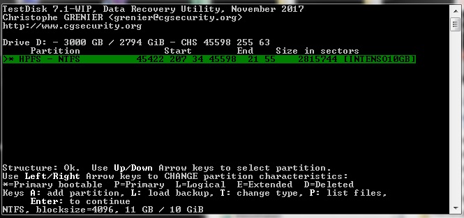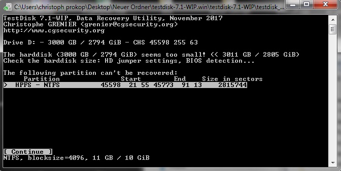 6. Testdisk mit „Intel“ quick scan durchlaufen lassen, 10 GB unverschlüsselte Partition gefunden (Screenshot „testdisk quick scan“) am Ende der Platte wie ich herauslese, d.h. der Backup Header kann nicht am Ende der Platte sein.