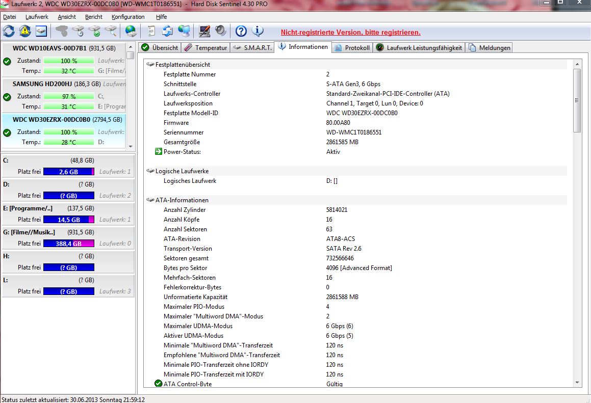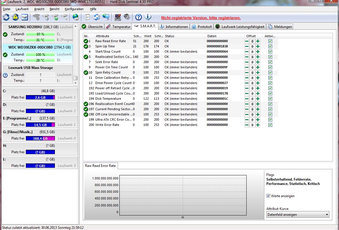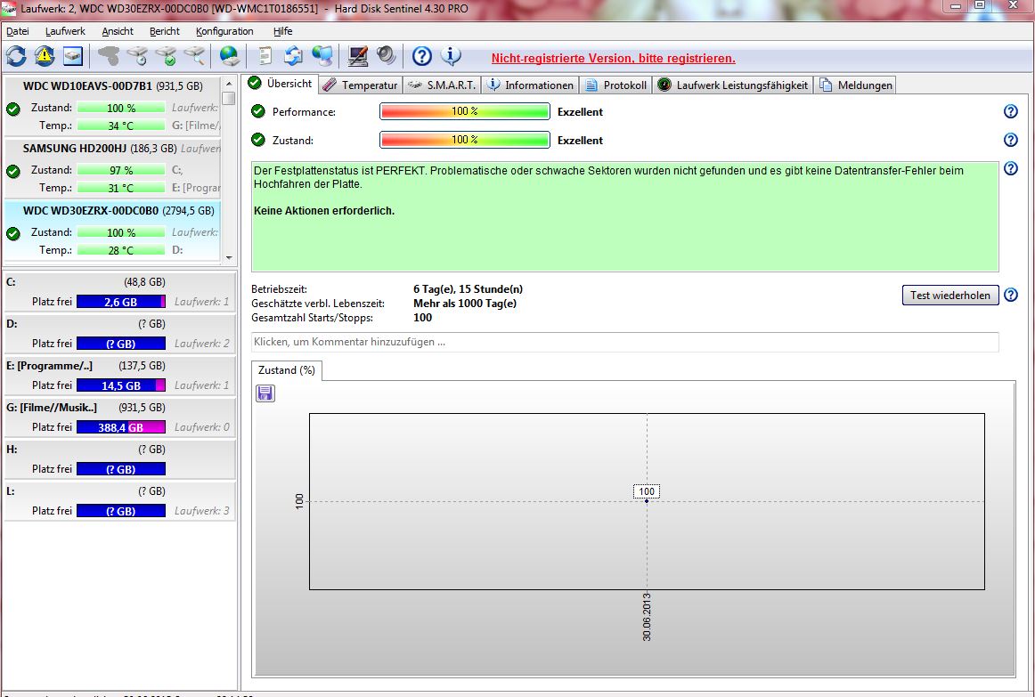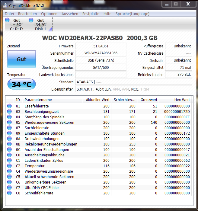 Die Platte sieht in Ordnung aus, sogar die Lese- und Schreibfehlerrate ist noch bei 0 (das ist bei den Western Digital Green HDDs häufig der erste Indikator für einen Defekt).