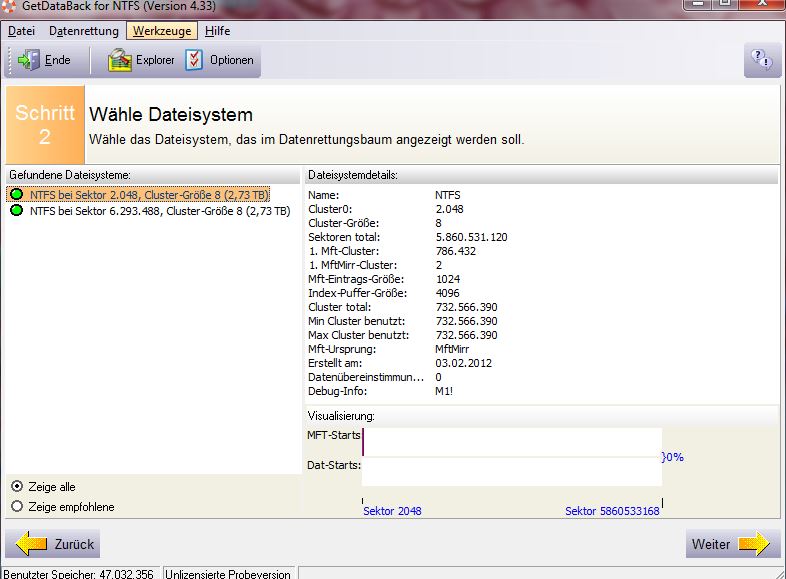 Wenn ich das mit TestCrypt gemountete Laufwerk mit GetDataBack for NTFS lade, habe ich Zugriff auf etwa 2% der Daten ...
