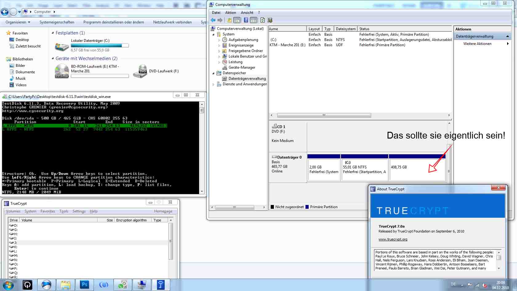 Verschlüsselt hab ich mit True Crypt 7, einmal C(55GB)(Also wenn man den Pc startet, musste man beim Booten das True Crypt Passwort eingeben)
