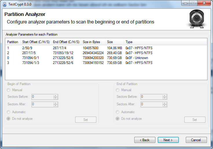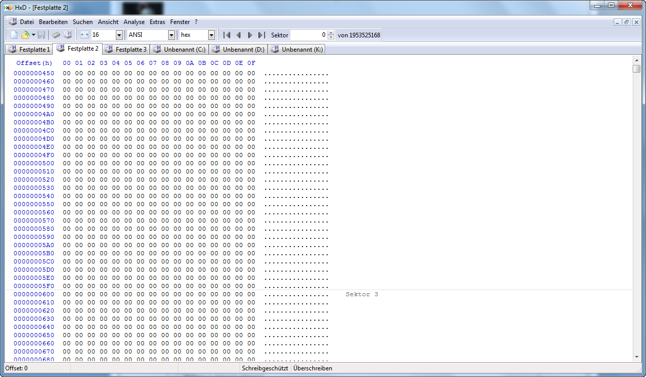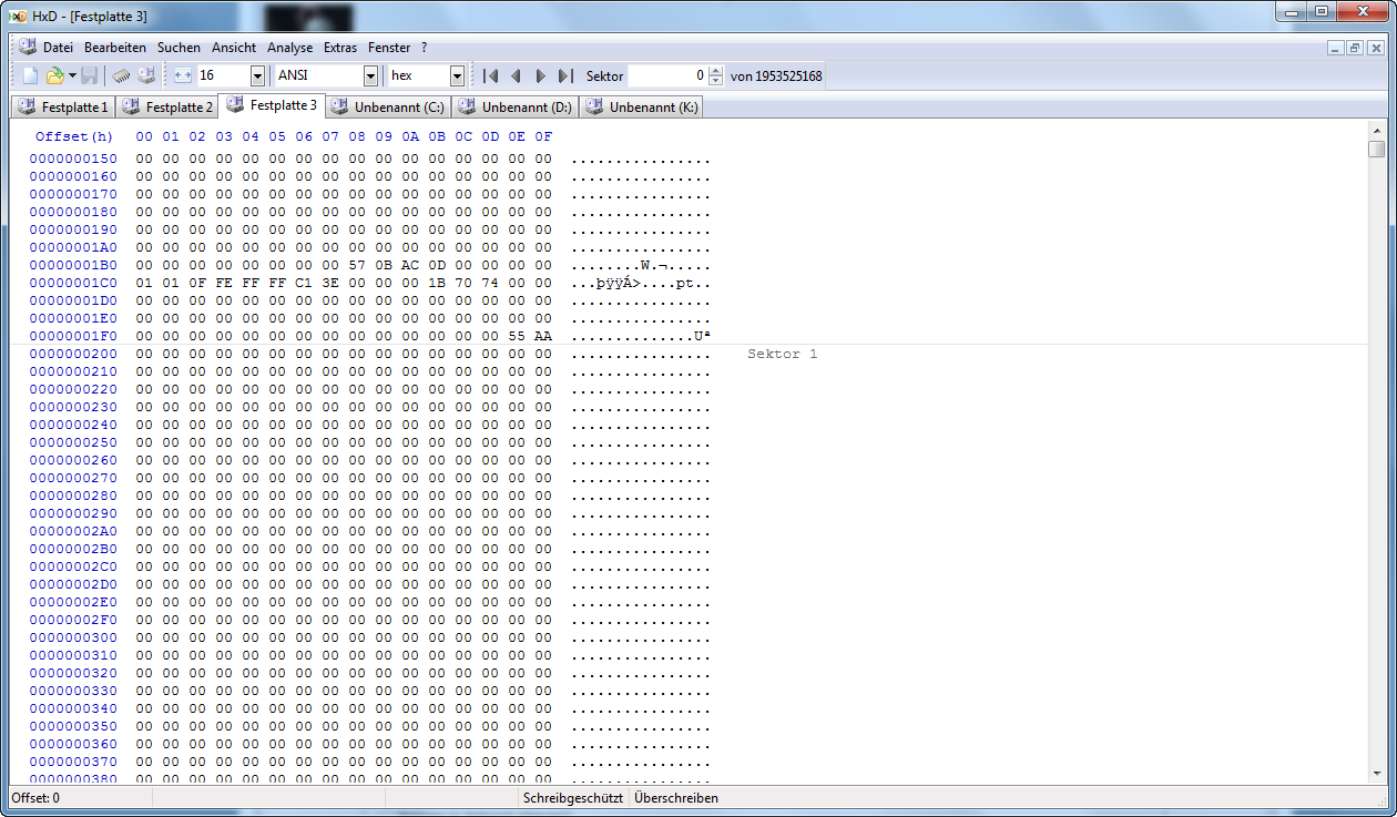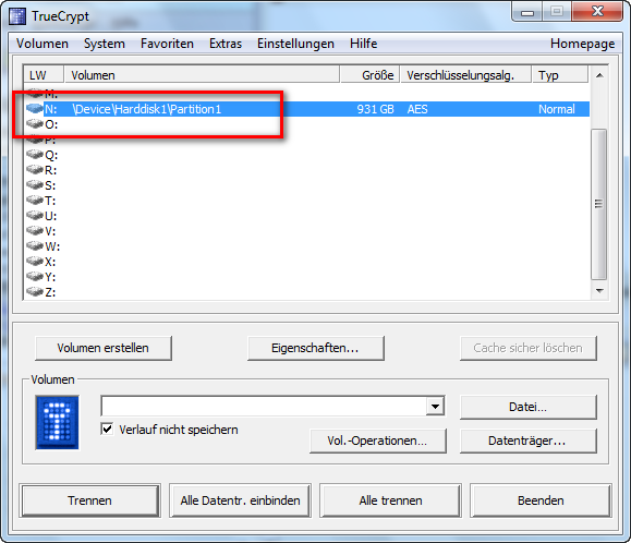 Hast du in HxD jetzt auch das Laufwerk N öffnen können? Für mich sieht das ganze nicht entschlüsselt aus, ich fürchte fast wir müssen die Partition doch mit testdisk erstellen. Nimm zunächst mal TestCrypt und zeige mir einen Screenshot mit der Partitionsübersicht (direkt nach dem Auswählen der Festpllatte).