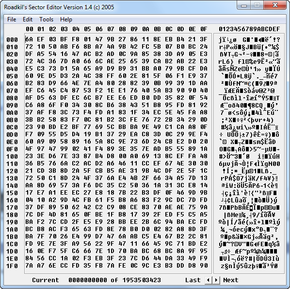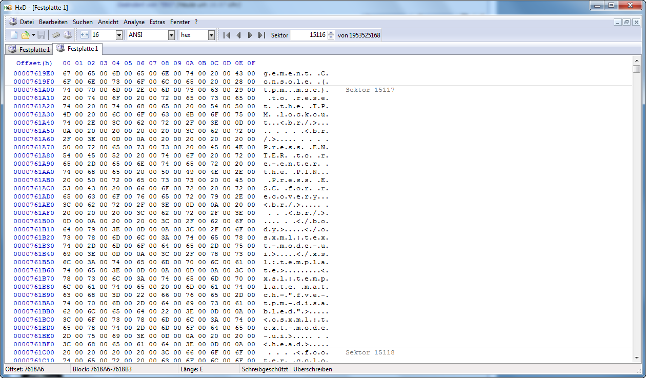 Scroll mal ein bisschen runter, ob du irgendwo Text siehst, den ein Mensch als Text verarbeitet. Du solltest du z.B. irgendwo die Dateinamen finden können (Achtung, diese können Unicode sein, ich weiß nicht, ob dieses Tool danach suchen kann - HxD hätte das gekonnt) oder auch Teile z.B. von auf der verschlüsselten Partition gespeicherten Textdokumente.