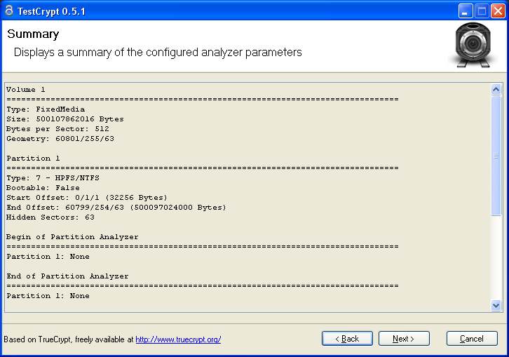 Da ich damals keine auffälligen Zahlenkolonnen finden konnte, mit Testdisk, habe ich jetzt einmal Testcrypt probiert. Ich habe lt. Screenshots die ganze Platte absuchen lassen (dauerte etwa 45 Minuten). Ergebnis: No boot header found.