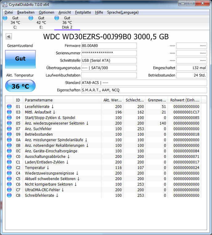 Bei dem Backupvorgehen bin ich momentan in der Optimierung. Zu CrystalDiskInfo der My Book: Ein Screenshot zum Wackelkontakt Adapter, im funktionierenden Moment, ist im Anhang. Bin im Moment auf der Suche nach einem guten Gehäuse für die Interne. Das soll allerdings keinerlei Emulation verwenden (werde wegen 512 Byte und 3TB dann GPT statt MBR verwenden).