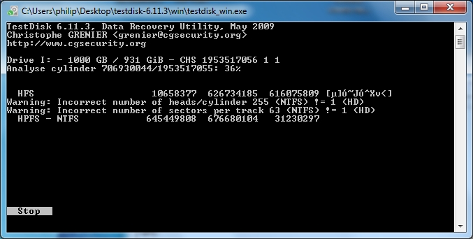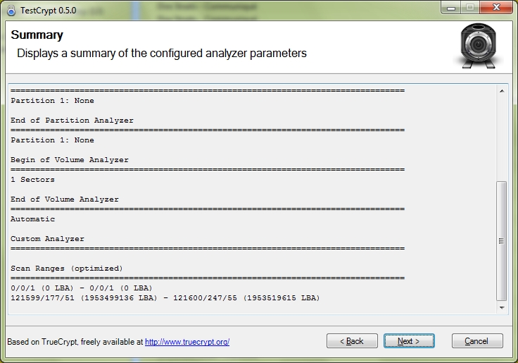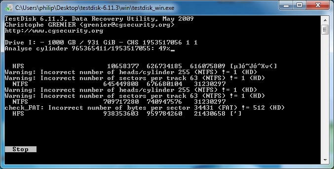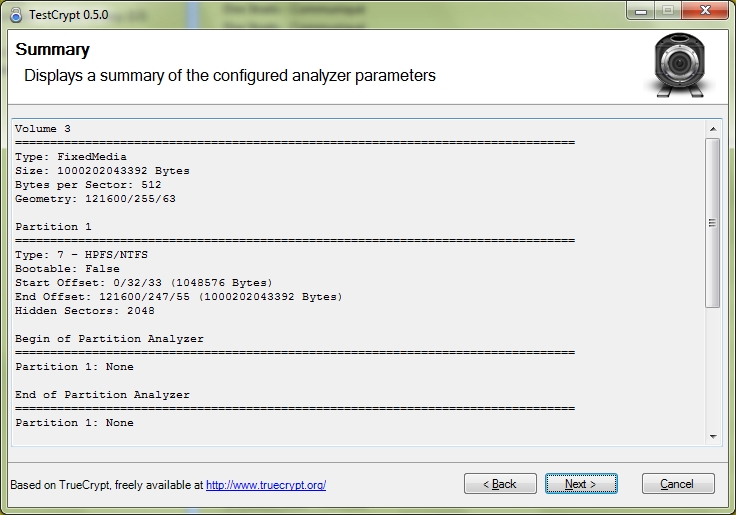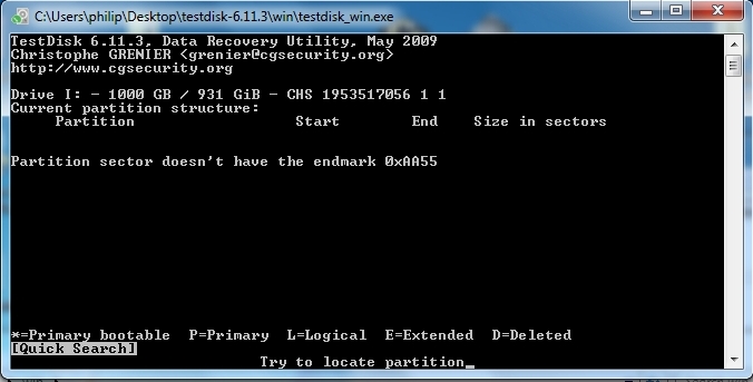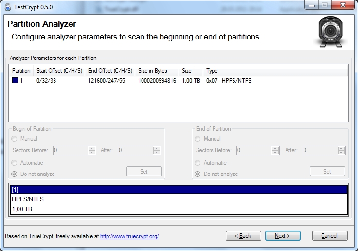 Ich hänge mal 2 screens von Testdisk an, mit denen ich herzlich wenig anfangen kann. Bei dem zweiten screen stoppte die Analyse einfach (Ich habe Intel partition unter Vista gewählt. Ich habe übrigens keine Ahnung, welches Dateisystem für ein unter Windows 7 erstelltes Truecrypt Volume verwendet wird.). Ich habe Testdisk analyse jetzt nochmal neu gestartet. Diesmal als non partitioned.
