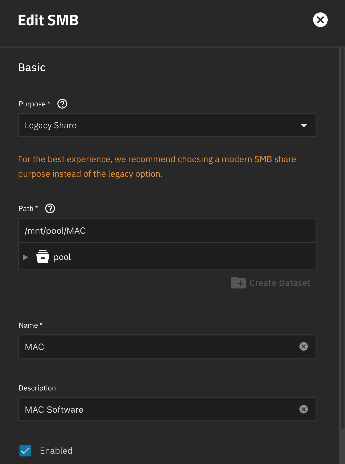 Die alten Freigaben sind Legacy Share und die funktionieren, die neue Freigabe ist Default Share, die funktioniert nicht mehr. Legacy Share kann ich nicht mehr auswählen. Sonst sind alle Einstellungen bei beiden Freigaben gleich.