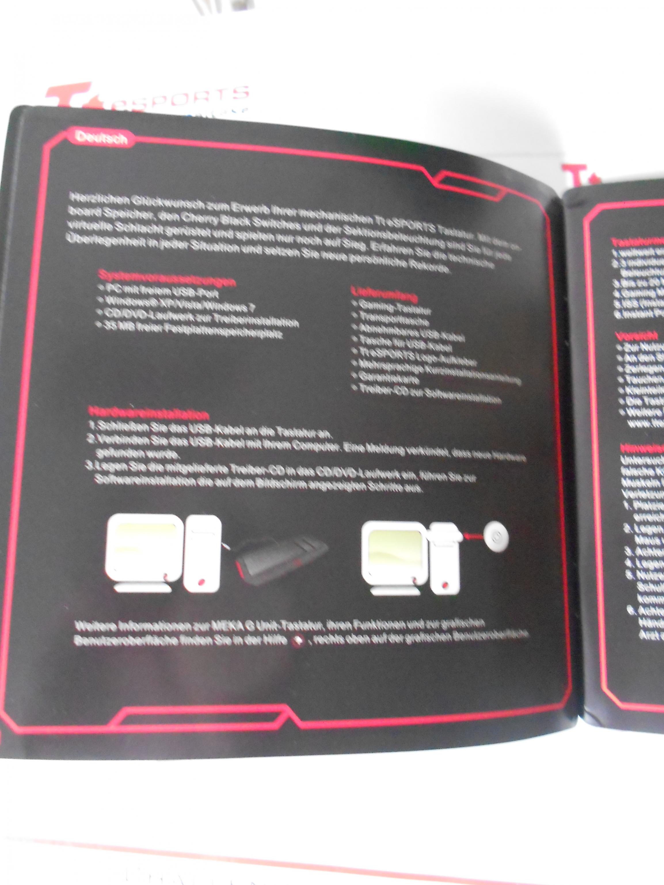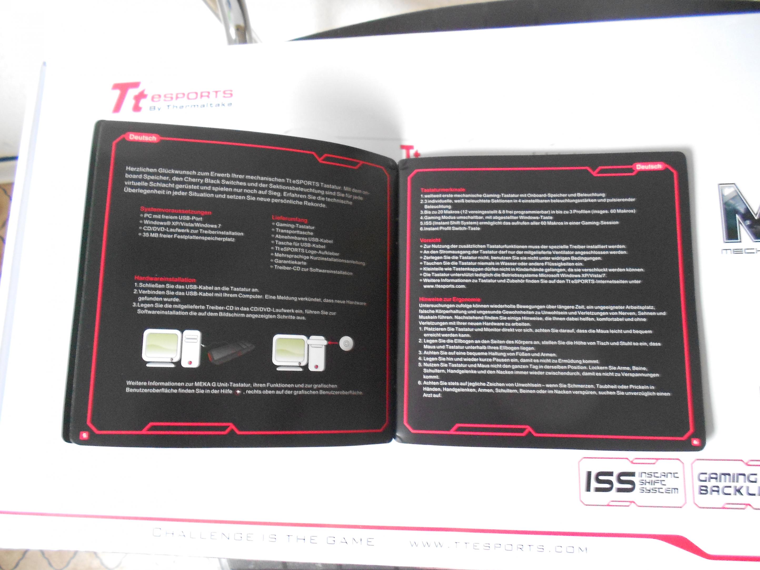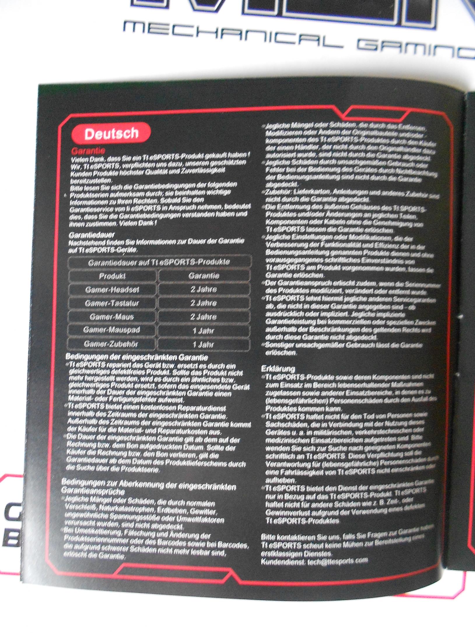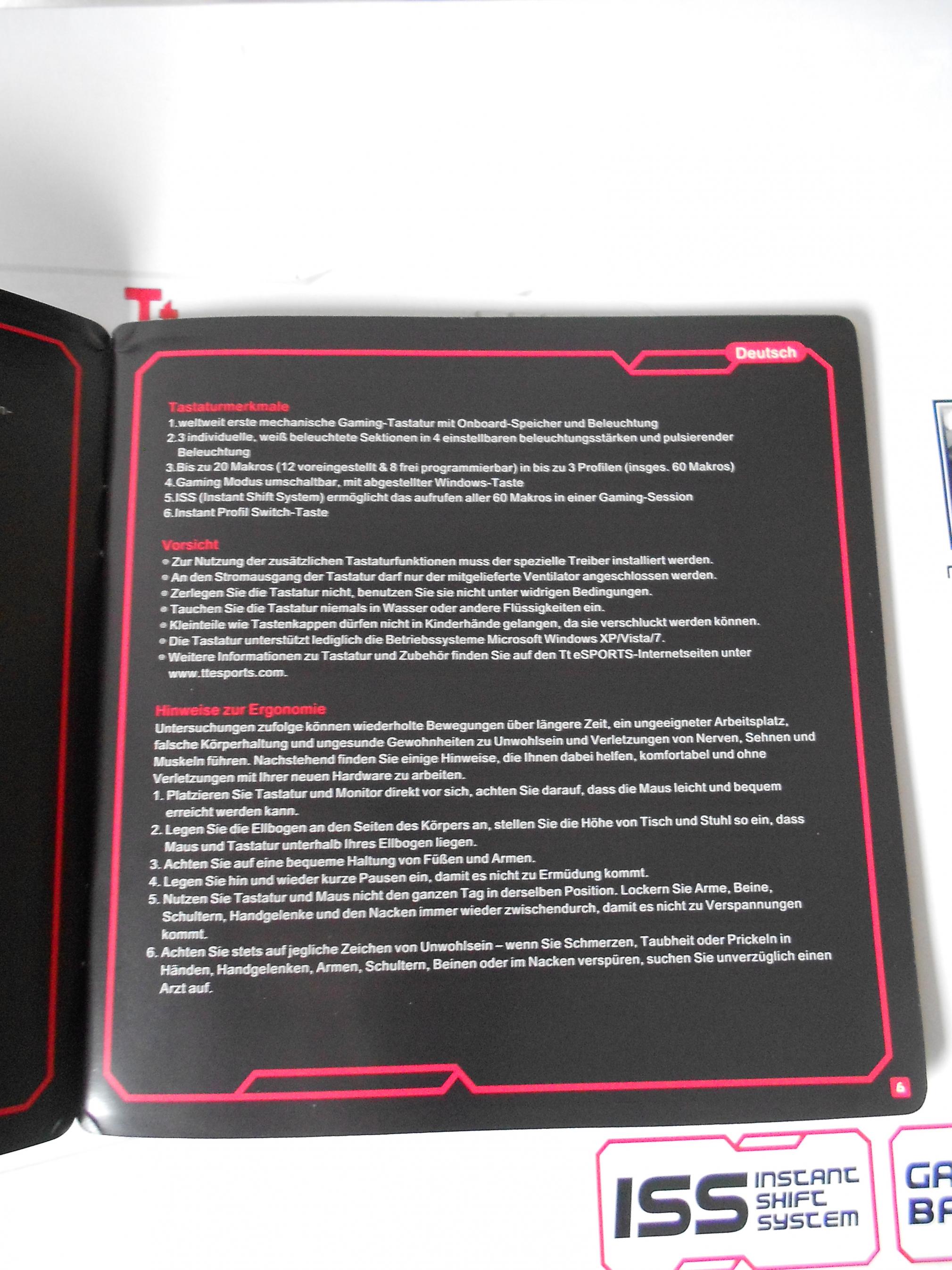 Als ich den Karton der Tastatur vor mir hatte, wurde ich erstmals von dem vielen Weiß erschlagen. Das schon ein Flash für meine Augen, da mein sonstiges Equipment am PC eigentlich nur Schwarz ist (+ deren Verpackung). Mir gefällt an dem Karton aber die große, gut lesbare Schrift echt gut. Dazu setzen die Farben Rot und Weiß die Verpackung und die Tastatur an sich in ein für mich sehr gutes Licht. Da diese Tastatur von Thermaltake und besser gesagt dem Esports Team ist,würde ich schon sagen dass diese Leute bei der Entwicklung der Tastatur ihre Arbeit mit der Qualität der Tasten und dem Aussehen vom Gesamt-Konzept mich zu Frieden stellt. Die Tastatur wirkt auf mich nicht so protzig wie ich es von Razer BlackWidow erlebt habe.