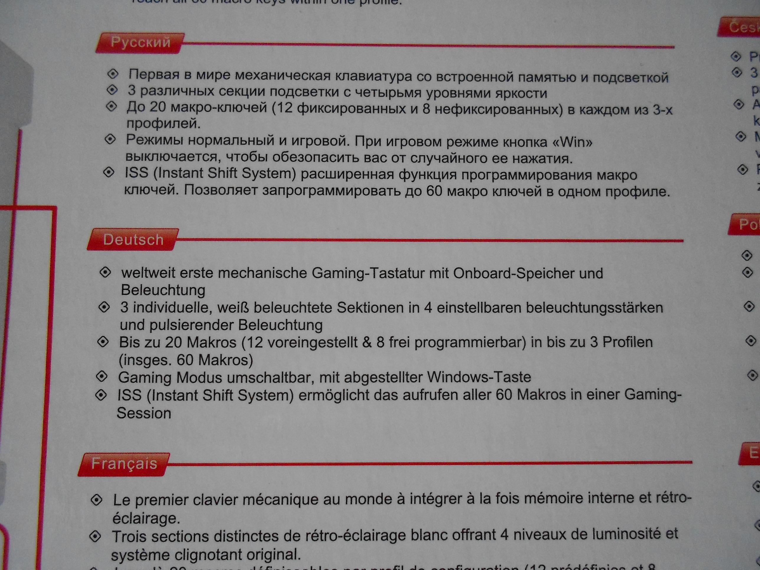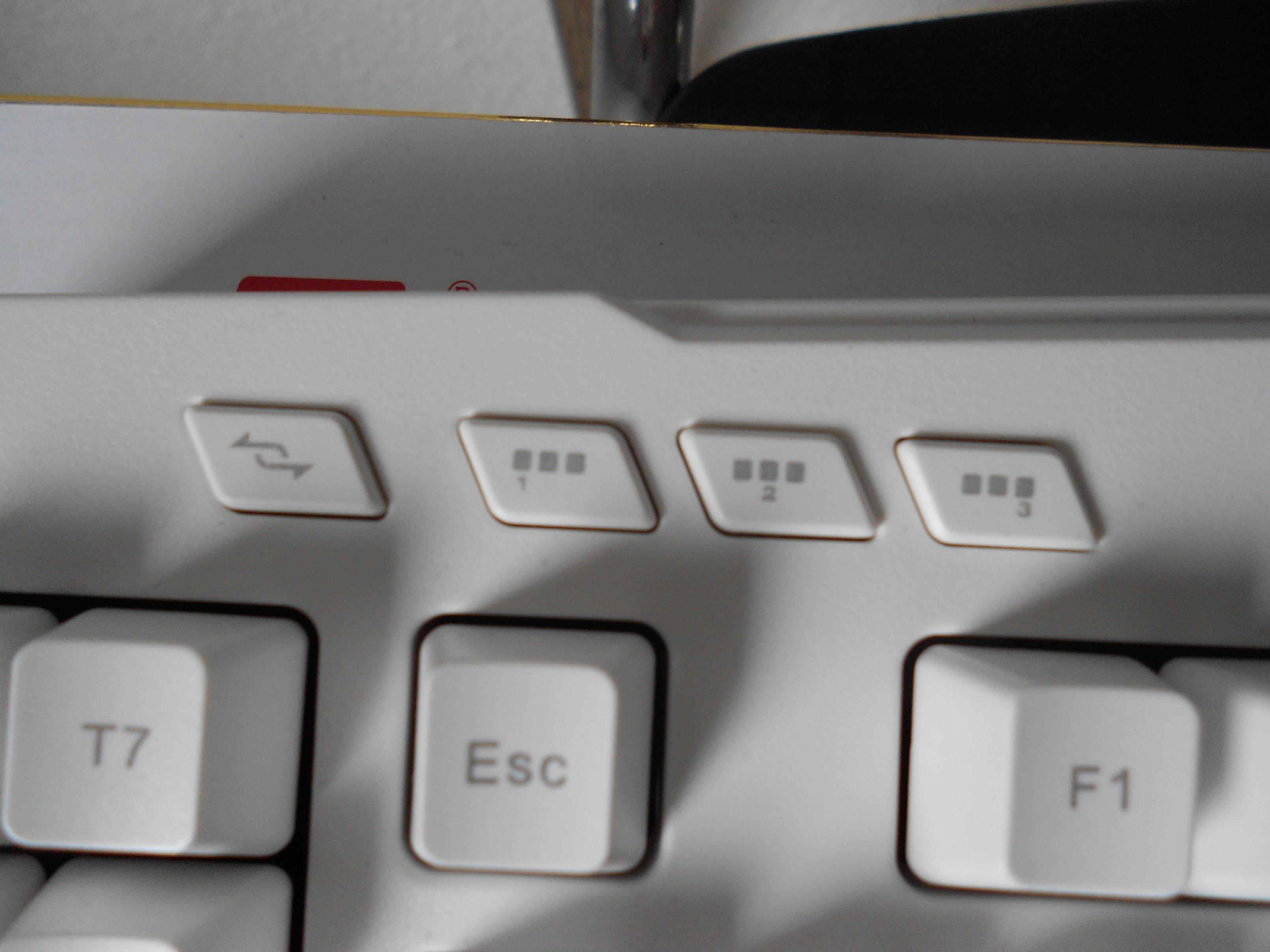 Über den Makro-Tasten an der rechten oberen Ecke befinden sich die Tasten für Game/Normal-Mode (Windows-Tasten an bzw. aus) und das ändern der 3-Profile (Speicherbar durch den integrierten Speicher). Der Speicher ist 64 KB groß, damit passen alle 60 Makros problemlos rein, ob man alle 60 wirklich je brauchen wird ist jedem selbst überlassen. Ich versuche erst ein mal für mich die 12 Makros zu verbrauchen und schau dann weiter.