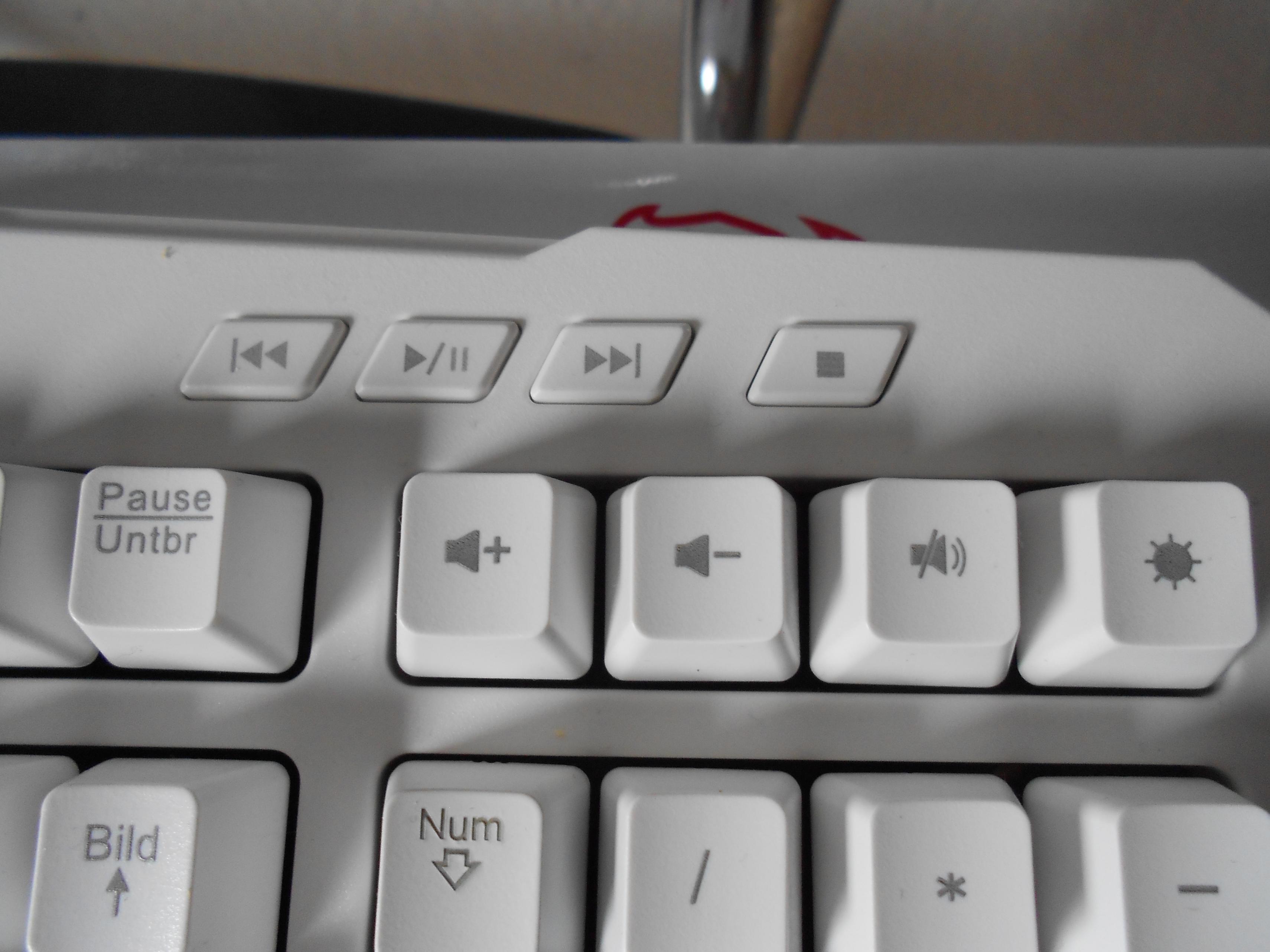An der linken oberen Seite sehen wir die Multimedia-Tasten und da drunter die Tasten zum Einstellen der Lautstärke +LED-Schalter.