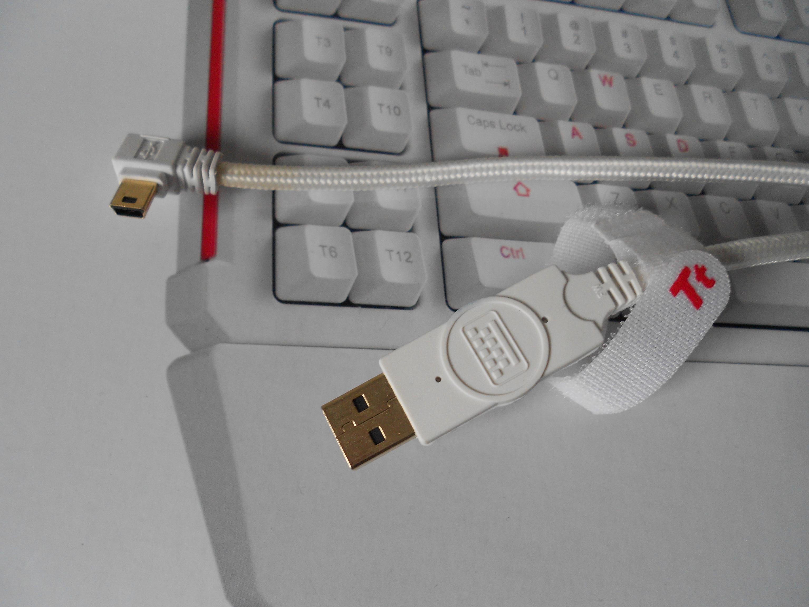An diese Tastatur kann man wenn gewünscht eine Handballen-Ablage anschließen. Da ich die Tastatur wie erwähnt auf meinen Knien/Oberschenkel - Liegeposition - habe, ist natürlich die Handballen-Ablage mit angesteckt. Dies sieht man deutlich auf dem 1.und 2. Bild (Vor- und Rückseite). Das USB-Kabel welches in der schwarzen Transport-Tasche mitgeliefert wird ist 1,90 m lang und wie die Tastatur in kompletten Weiß-Look gehüllt. Der Mini-USB der an der Tastatur und der große USB der an den PC geschlossen wird sind wie üblich bei solchen Tastaturen vergoldet. Diese Kabel hat den Vorteil dass man einem Umzug oder Lan-Party es abstecken kann und in der Transport-Tasche vor Kabelbruch schützen kann, sollte mal so was geplant werden.