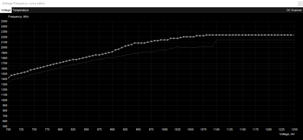Bei meiner 2080ti ähnlich. Wobei mein Ziel nie die höhere Taktrate ist, sondern nur eine höhere bei Originalen Verbrauch. Der OC Scanner spuckt auch super die aktuelle Limitierung aus. Bisher eigentlich zu 99% Power. Andere Limits sehe ich da selten.