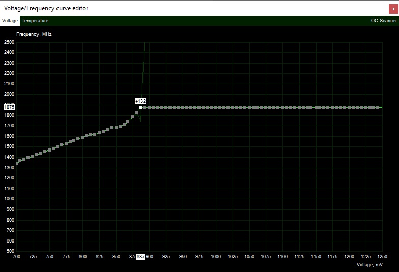 Weiß aber (auch durch OC Scan) wie viel im normalen mV Rahmen geht. Kann also meine Kurve schon mal direkt bis zu dem Punkt hochziehen. (Waren bei mir +135 Mhz damals)
