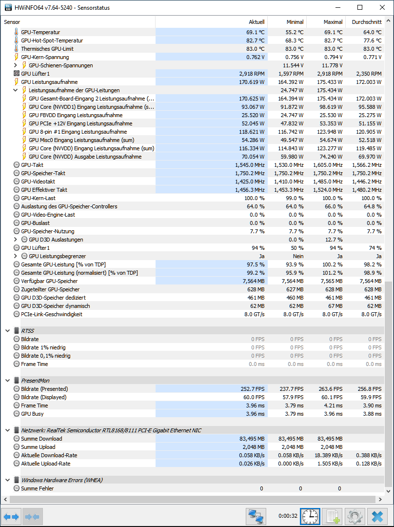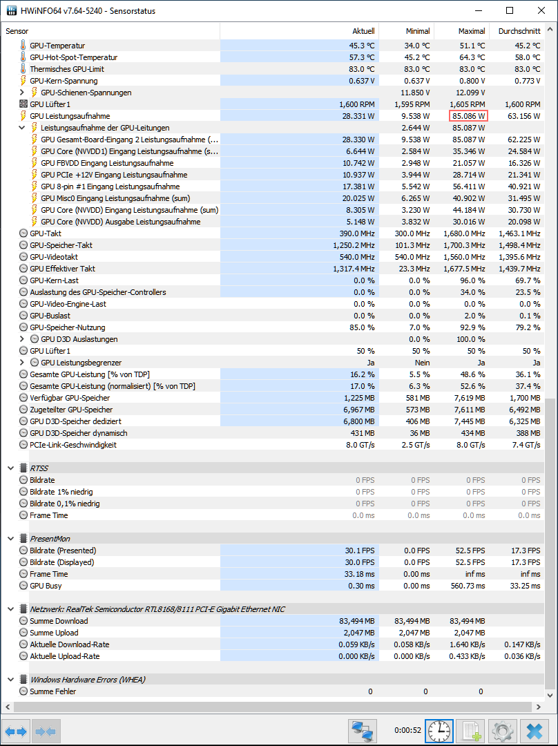 Jedenfalls stimmt da was nicht, ich habe bei Spielen mit meiner 2060 Super 16XX MHz nur 86 Watt Verbrauch (GPU Gesamtleistungsaufnahme/HW-Info) und im Furmark Stresstest mit 15XX MHz 176 Watt Verbrauch, das sind 90 Watt mehr bei gleichzeitig niedrigerer Taktfrequenz im Vergleich. xD