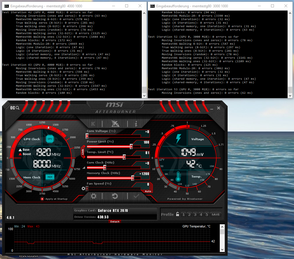 Das gilt hier aber nur, wenn die GPU @stock bleibt. Missbrauche ich memtestg80 als Stabilitätstest für GPU- und VRAM-OC, ist kein einziges meiner Afterburner-Profile stabil; bei jedem einzelnen werden Fehler angezeigt. Mal sehen, ob ich das ignoriere oder weiter teste ...