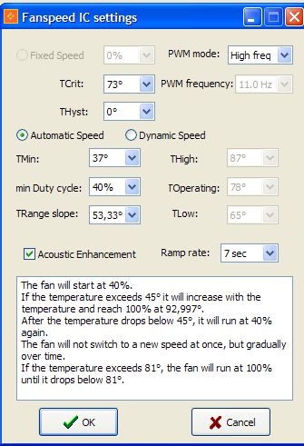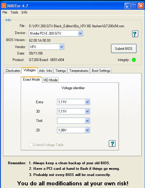 Ich habe noch mal außgiebig mit diversen Bioseinstellungen meiner XFX-BE getestet und habe jetzt für meine Karte gute Einstellungen gefunden. Als Grundlage habe ich die Einstellungen von @risingSilence genommen, und die für meine Karte etwas modifiziert. Ich habe die Karte etwas übertaktet, 702-1404-1224, die Spannung für den 3D-Bereich auf 1.11V gestellt und die "Ramp rate" von 1.6 sec auf 7.0 sec angehoben.