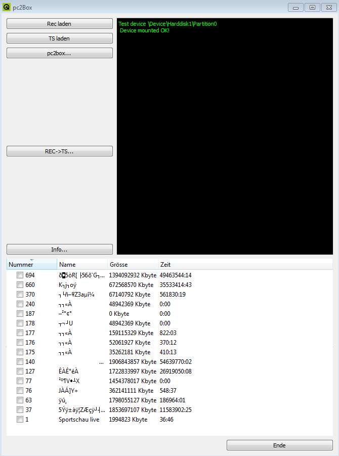 Mit dem Programm pc2box kann ich die Aufnahmen auf den PC übertragen, was seit o.g. Fehler einen Haufen "Datenmüll"zeigt. Nur die untere Datei habe ich aufgenommen, wo der Rest herkommt, weiß ich nicht.