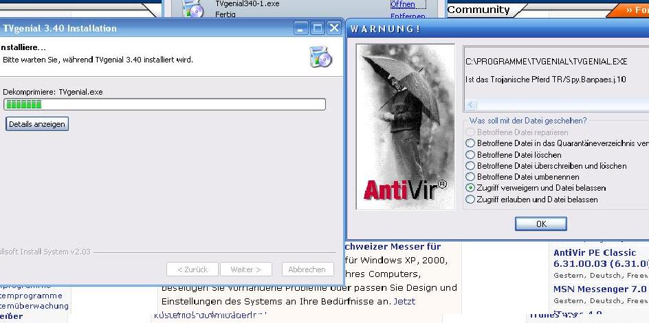 ich wollte gerade TV Genial installieren und da schlägt mein Virenscanner Alarm! Und das schon bei der installation. Es ist egal ob ich die installation von cb nehme oder direkt von der Homepage!
