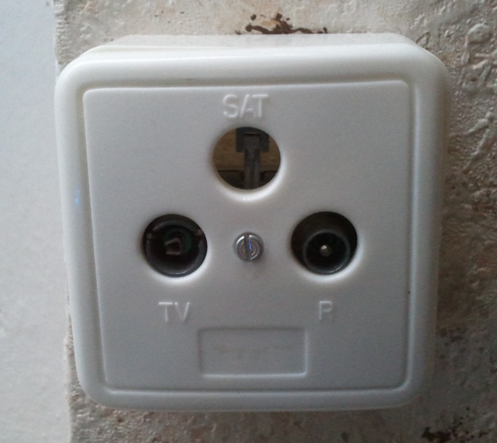 Ich habe hier in meinem Studentenzimmer eine Sat-Dose mit 3 Anschlüssen ("sat", "tv", "r"; Bild habe ich angehängt). Sieht für mich so aus, als wäre der obere Anschluss leer O.o