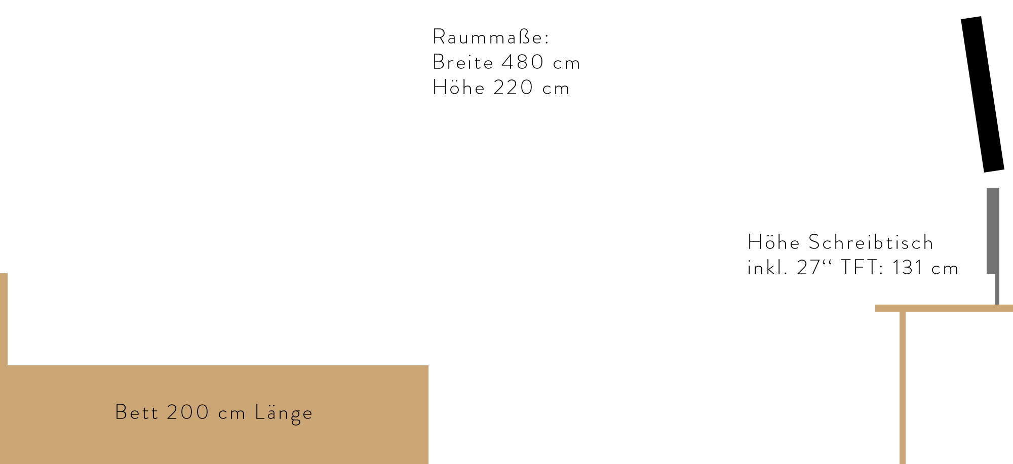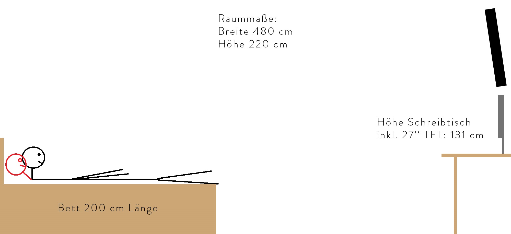 Das Bett befindet sich ca. 460 cm entfernt vom Fernseher , der Fernseher wäre knapp unter der Decke, die 220 cm hoch ist, angebracht.