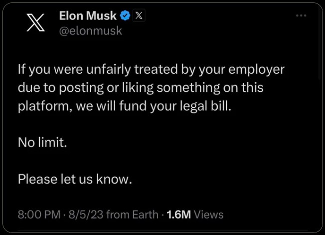 ohne Begrenzung“ zu übernehmen, sofern jemand wegen Beiträgen auf Twitter/X Ärger mit seinem Arbeitgeber hat. Die Reaktionen sind erstaunt bis kritisch. So verweist etwa