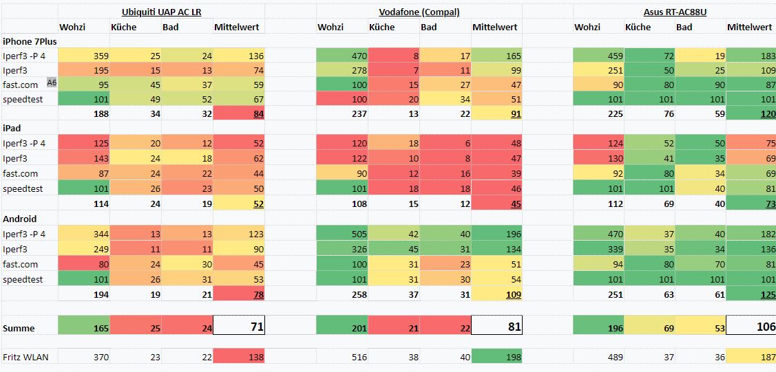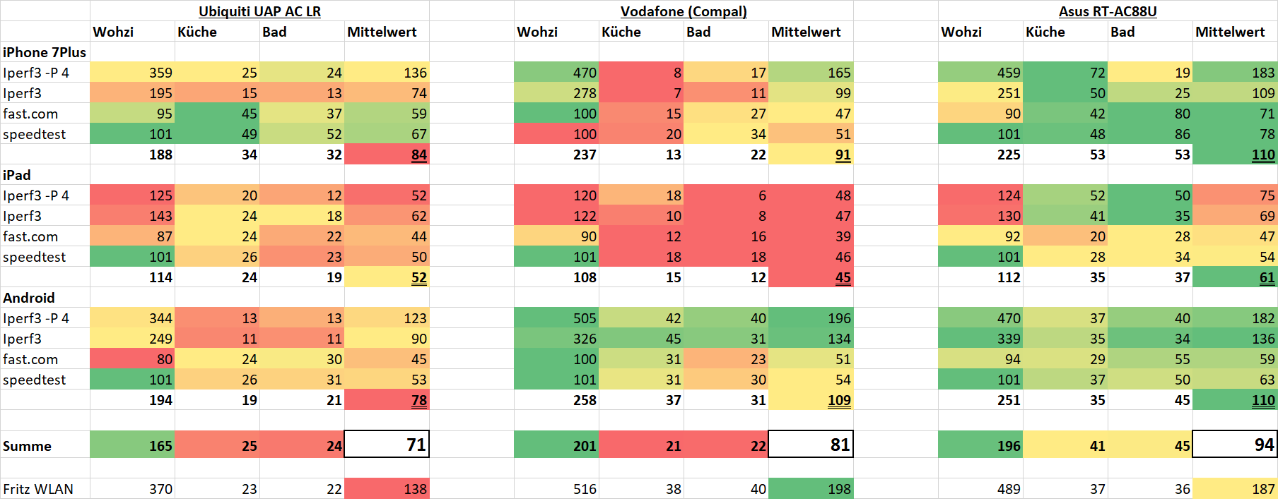 Anbei eine Grafik mit den Testergebnissen, habe mit drei Geräten (iPhone 7Plus, samsung S6, iPad Mini 2) getestet, direkt neben dem AP, in der Küche und im Bad. Einmal mit speedtest.net und fast.com um zu schauen was von der 100er Leitung von VF ankommt, und einmal mit iperf3, um den interen Netzwerkdurchsatz zu prüfen.