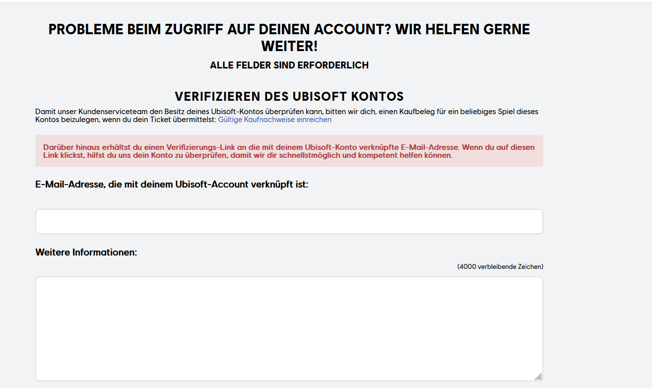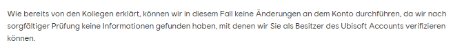 Auch komisch finde ich, dass Ubisoft damit wirbt, dass man Kaufbelege einreichen kann, um zu bestätigen, dass man der Kontoinhaber ist (s. Anhang), aber sobald ein Kaufbeleg eingereicht wird, ist dieser nicht mehr ausreichend, um sich als Kontoinhaber zu bestätigen. Weiter bei Ubisoft nachzuhaken, bringt denke ich nicht viel. Ich erhalte immer wieder die gleichen Antworten. Manchmal hab ich auch das Gefühl, dass ich nicht mit einem Menschen schreibe, weil die Antworten gar nicht auf meine Fragen eingehen. So langsam fühle ich mich verarscht von Ubisoft.