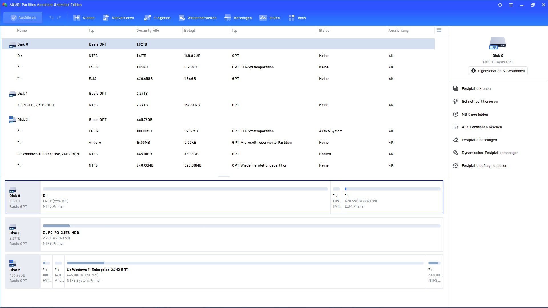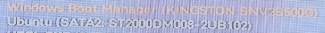 Der Rechner bootete aber leider nur stumpf mein Windows 11 24H2. Von einem Linux-Boot Manager war weit und breit nichts zu sehen. Ich habe mir die Partitionen angeschaut und sehe auf der 2TB-Sata-HDD sehr wohl die ext4-Partittion und auch eine 1,05GB große Fat32-Partition (EFI).