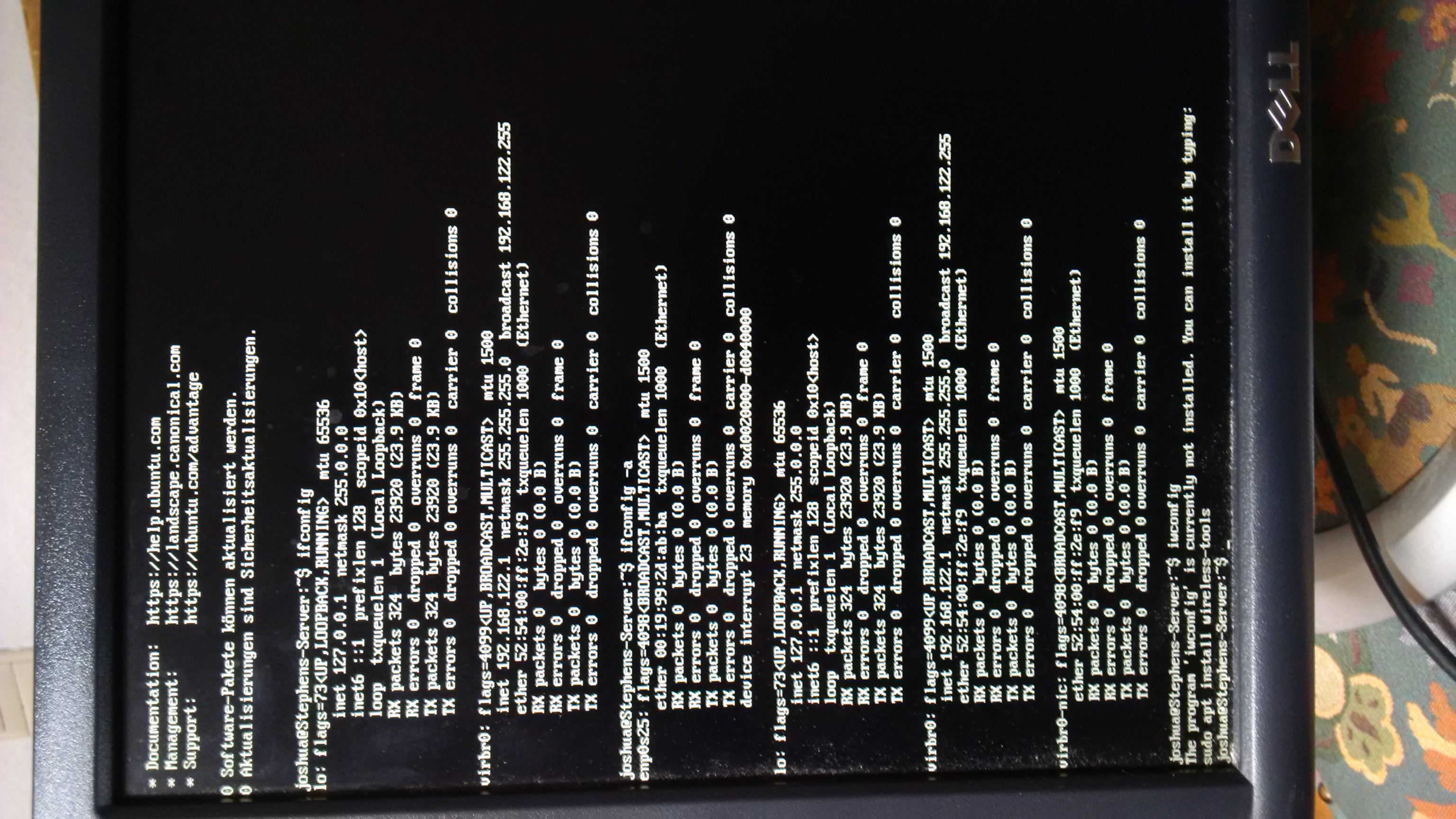 Also habe ich mir mal die Interfaces mit ,,ifconfig" und ,,ifconfig -a" angeschaut. (siehe Foto, sorry leider nur Handybild, weil ich habe ja kein Internet auf den Rechner