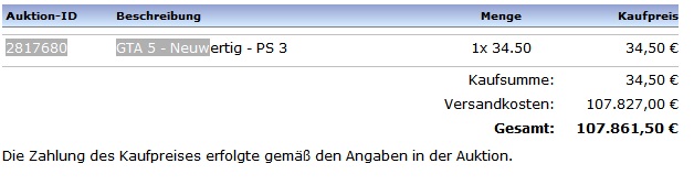 Hallo Leute! Ich habe gestern bei roteerdbeere.de GTA 5 für die PS3 für 34,50 € + 2,50 € Versandkosten geauft. Ich habe das Spiel per Paypal bezahlt. In meinem Paypalkonto ist ein Abbuchungsbetrag von 37€ angegeben. Hier ein Foto der Auktion: